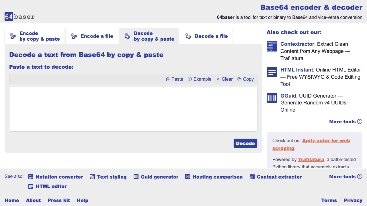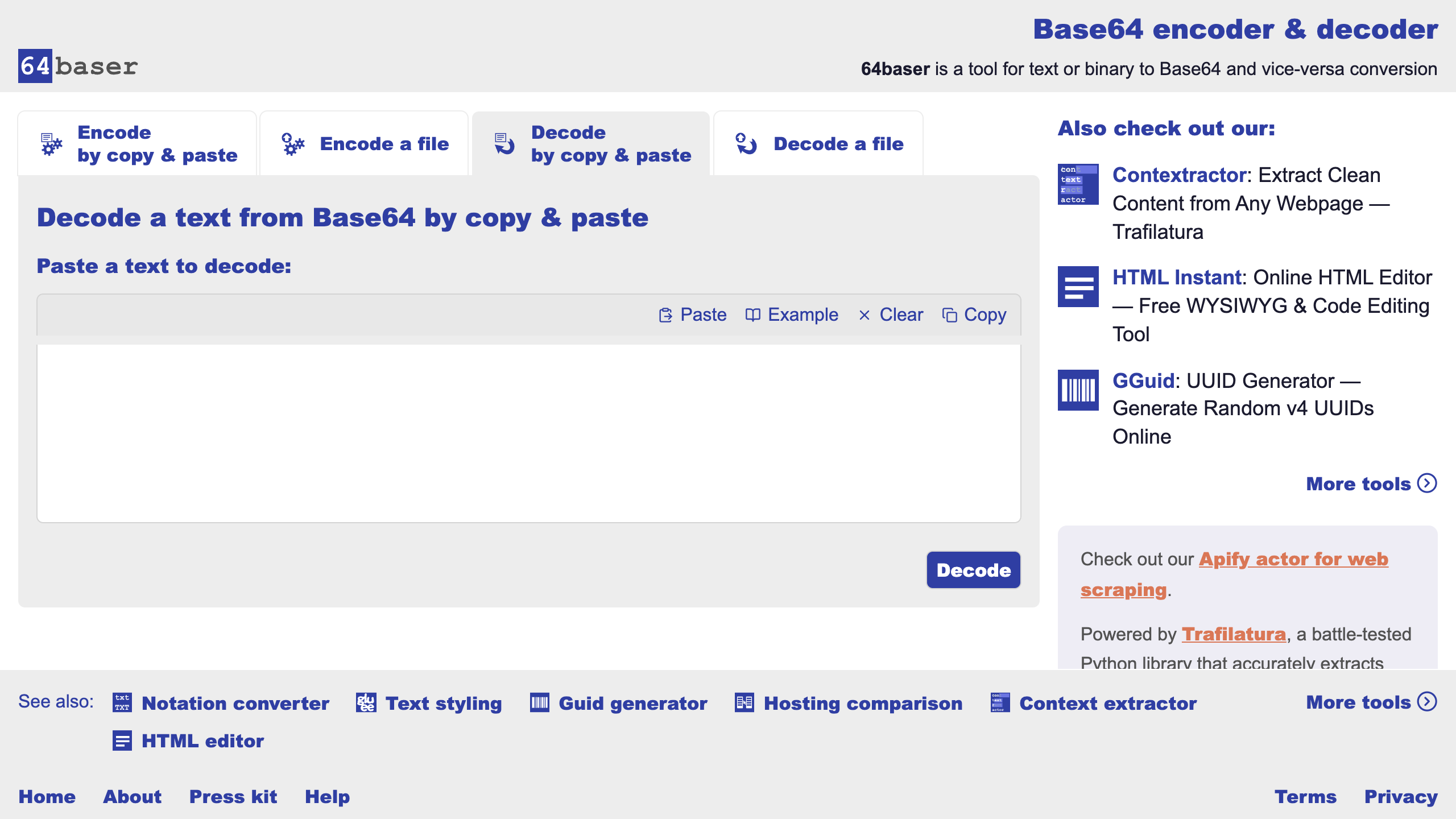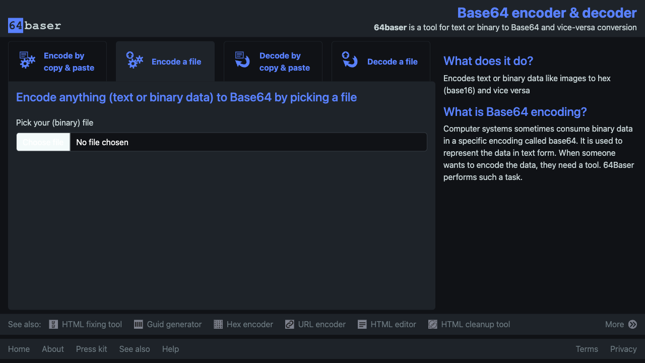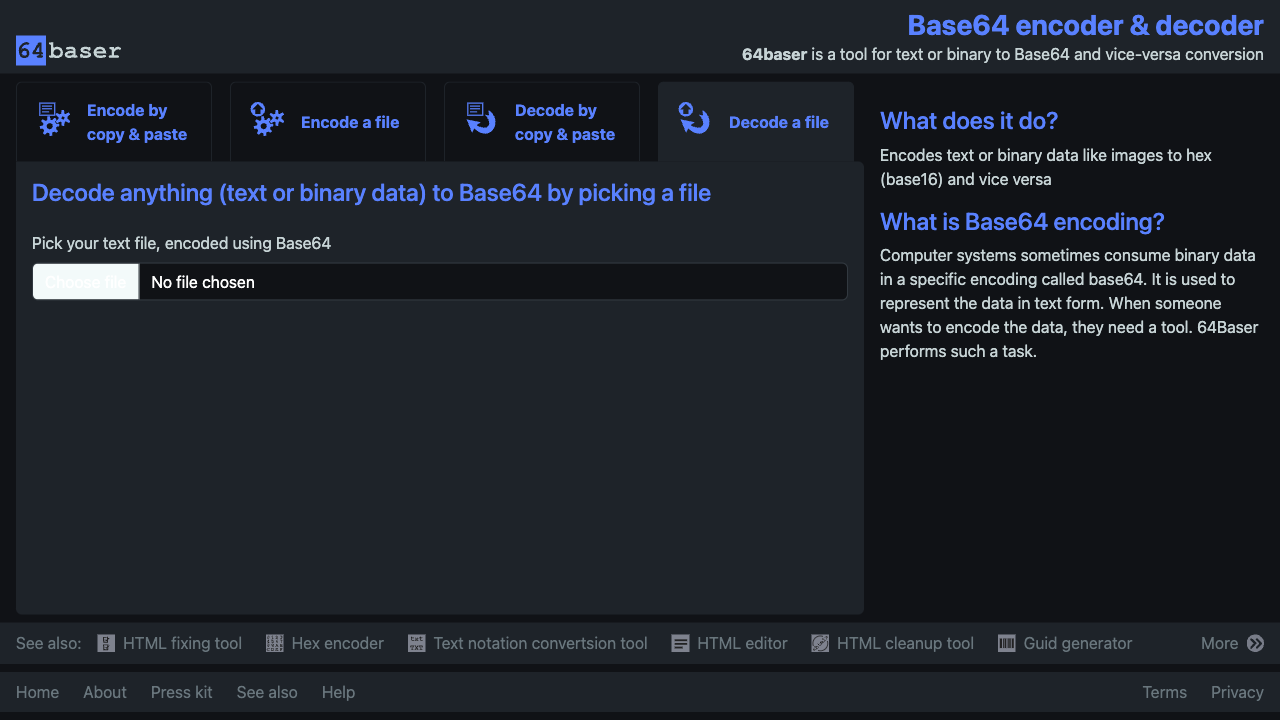 64baser is a tool for text or binary to Base64 and vice-versa conversion
